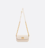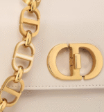 The 30 Montaigne Avenue bag enhances the hallmark line with a timeless and elegant style. Crafted in Dusty ivory box calfskin, the rounded flap with delicate curves is punctuated by an antique gold-finish metal CD clasp inspired by the seal of a Christian Dior perfume bottle. The design is completed by other details, like the 30 Montaigne signature embossed on the back and the signature chain alternating gold-finish metal and tonal enamel links that match the leather. The gusseted bag features a spacious and refined silhouette that can be carried by hand, worn over the shoulder or crossbody.