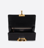 The 30 Montaigne line is inspired by the emblematic address and offers essential pieces that embody the House’s iconic codes. The handbag is crafted in black box calfskin for an elegant and modern look. The flap is embellished with an antique gold-finish metal ‘CD’ clasp, inspired by the seal of a Christian Dior perfume bottle. Refined details, such as an embossed ’30 MONTAIGNE’ signature on the back, define this unique design. Featuring an adjustable leather shoulder strap, the bag may be carried by hand, worn over the shoulder or crossbody.