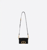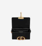 The 30 Montaigne line is inspired by the emblematic address and offers essential pieces that embody the House’s iconic codes. The compact handbag is crafted in black box calfskin for an elegant and modern look. The flap is embellished with an antique gold-finish metal ‘CD’ clasp, inspired by the seal of a Christian Dior perfume bottle. Refined details, such as an embossed ’30 MONTAIGNE’ signature on the back and the military-inspired buckle, define this unique design. Featuring an adjustable leather shoulder strap, the bag may be carried by hand, worn over the shoulder or crossbody.