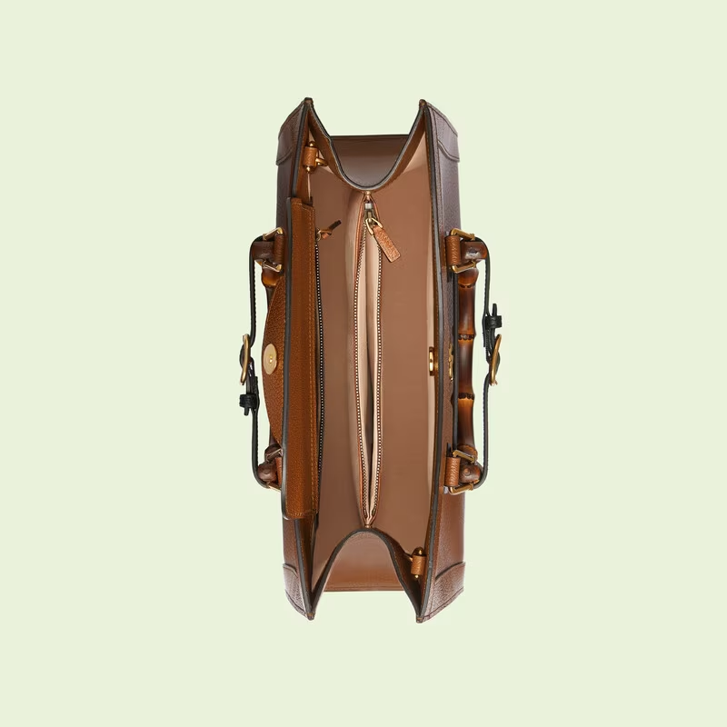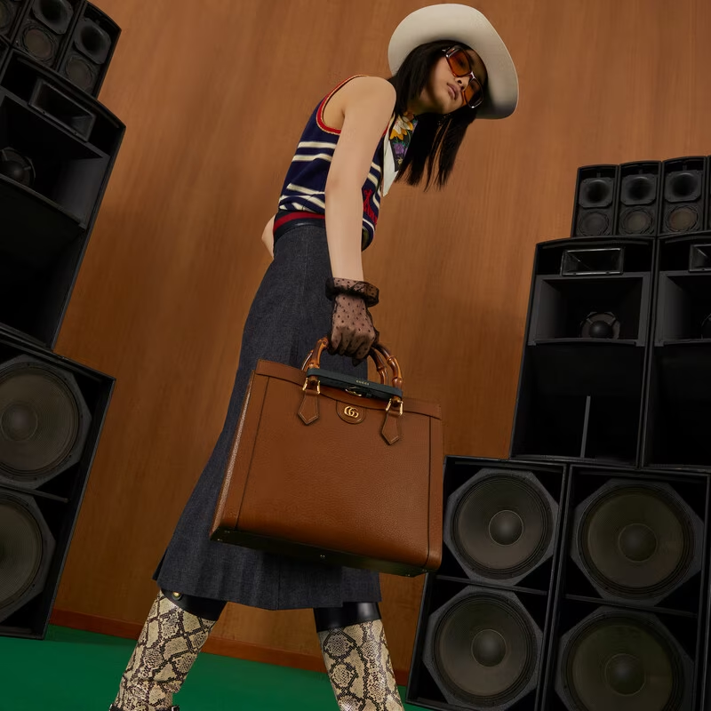 First used in the post-war era when traditional materials were hard to come by, bamboo has become not only a symbol of the spirit of reinvention that runs throughout the House’s designs but one of Gucci’s most recognisable signatures. The Gucci Diana embodies this idea, representing the notion of style in constant evolution with its removable leather belts—a nod to the functional bands used to keep the handles in shape. Here, the bag is presented in cuir leather.