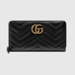 Small size: 10″W x 6″H x 3″D | GG Marmont zip around wallet | The GG Marmont collection is defined by the emblematic Double G hardware—a contemporary take on a Gucci archival belt buckle from the ’70s that has become a hallmark of the House. The zip-around wallet is crafted in soft matelassé leather that coordinates with bags of the collection. | Black matelassé chevron leather with GG on the back | Antique gold-toned hardware | Double G | 12 card slots and three bill compartments | Zip coin pocket | Zip around closure | 7.4″W x 4″H x .7″D