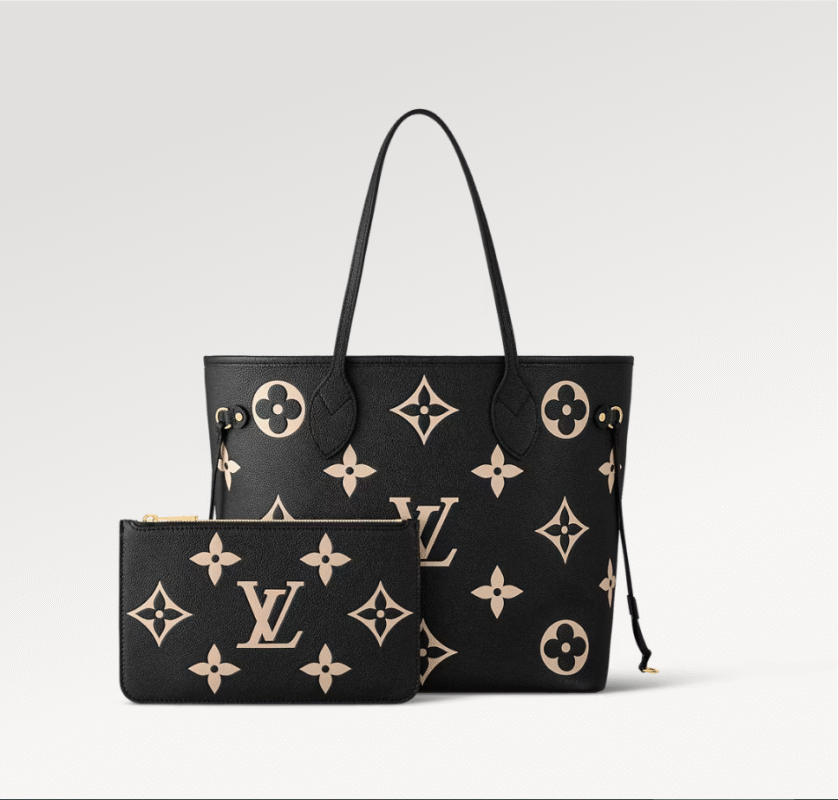 Ideal for everyday use, the roomy Neverfull MM tote bag is made from black cowhide leather with the Monogram pattern embossed then printed in beige on the leather. Cinch the side laces and this tote transforms into an elegant city bag. It can be carried on the shoulder or the elbow, thanks to the long shoulder handles.
