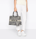 Introduced by Maria Grazia Chiuri, Creative Director of Christian Dior, the Dior Book Tote has become a staple of the Dior aesthetic. Designed to hold all the daily essentials, the style is fully embroidered with a blue Toile de Jouy Reverse motif, a variation of the House’s hallmark pattern with a play on reversed colors. Adorned with the ‘CHRISTIAN DIOR PARIS’ signature on the front, the medium tote exemplifies the House’s signature savoir-faire and may be carried by hand or worn over the shoulder.